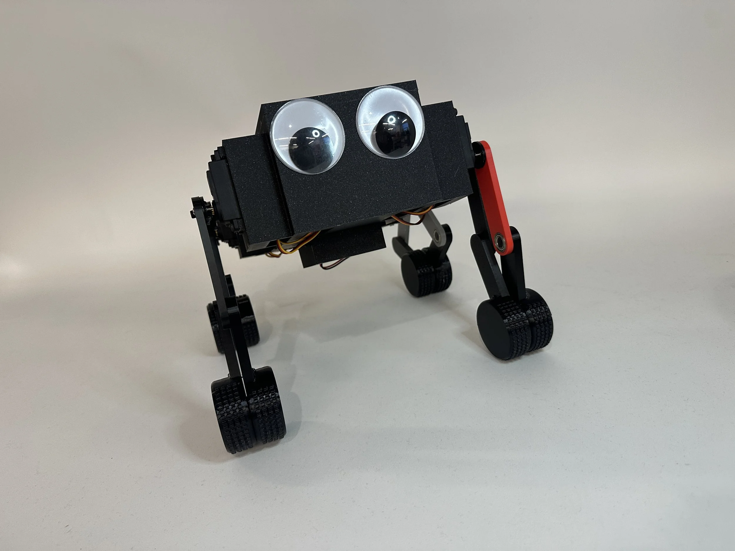 The Fully Responsive Electro-Mechanical Dog is a 3D-printed quadruped robot. The goal was to create a dynamically stable walking robot capable of wireless control, adaptive gait patterns, and expressive behavioral emotes, including sitting and play bow stances, while keeping the cost relatively low for a personal robotics project.